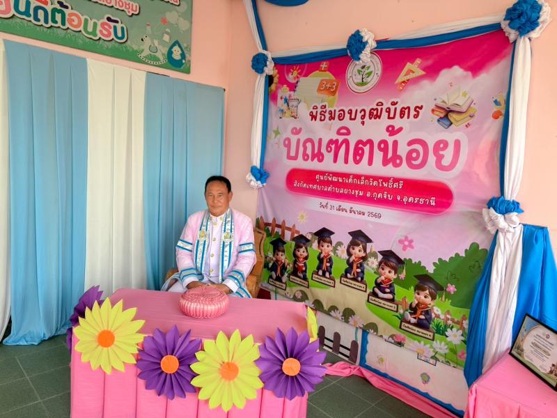 วันที่ 31 มีนาคม 2569 นายสมควร ระเเพงศรี นายกเทศมนตรีตำบลยางชุม พร้อมด้วยคณะผู้บริหาร สมาชิกสภาเทศบาล หัวหน้าส่วนราชการ ข้าราชการ ผู้ปกครองเด็กเข้าร่วมพิธีมอบวุฒิบัตร บัณฑิตน้อย ณ ศูนย์พัฒนาเด็กเล็กวัดโพธิ์ศรี สังกัดเทศบาลตำบลยางชุม อำเภอกุดจับ จังหวัดอุดรธานี