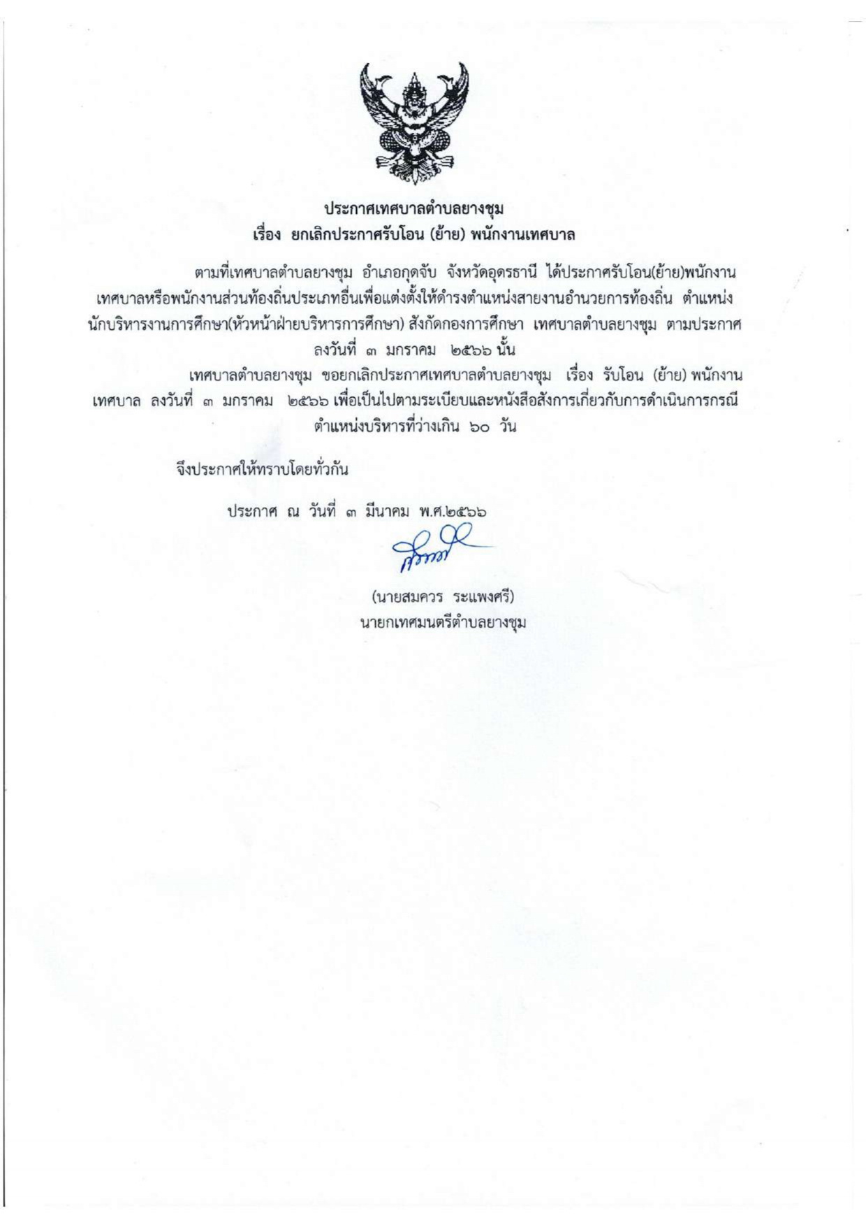 ประกาศเทศบาลตำบลยางชุม เรื่อง ยกเลิกประกาศรับโอน (ย้าย) พนักงานเทศบาล