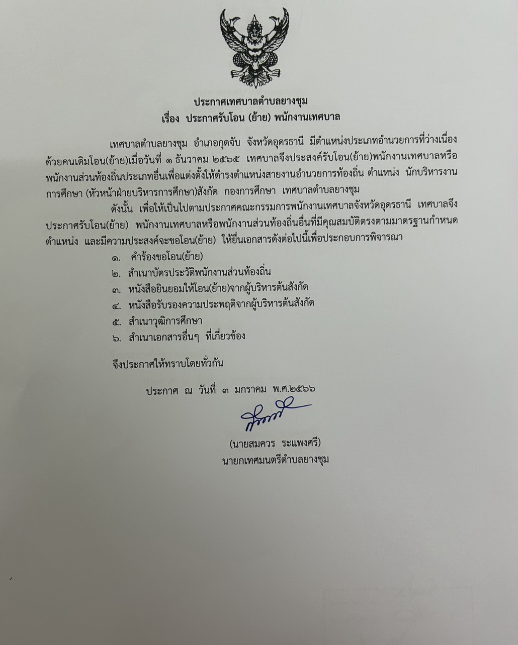 ประกาศรับโอน (ย้าย) พนักงานเทศบาล ตำแหน่ง นักบริหารงานการศึกษา
