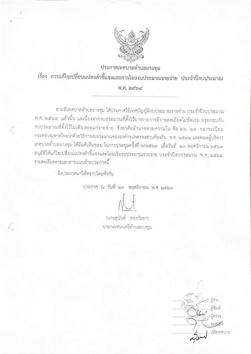 ประกาศเทศบาลตำบลยางชุม เรื่อง แก้ไขเปลี่ยนแปลงคำชี้แจงและการโอนงบประมาณรายจ่ายประจำปีงบประมาณ พ.ศ.2564