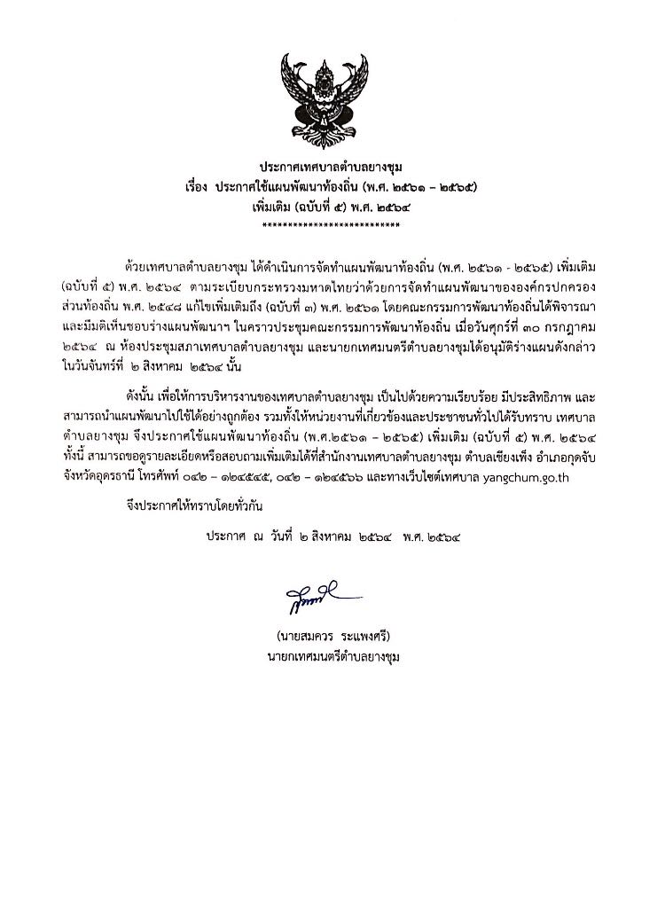ประกาศเทศบาลตำบลยางชุม เรื่อง ประกาศใช้แผนพัฒนาท้องถิ่น (พ.ศ.2561 – 2565) เพิ่มเติม (ฉบับที่ 5) พ.ศ.2564