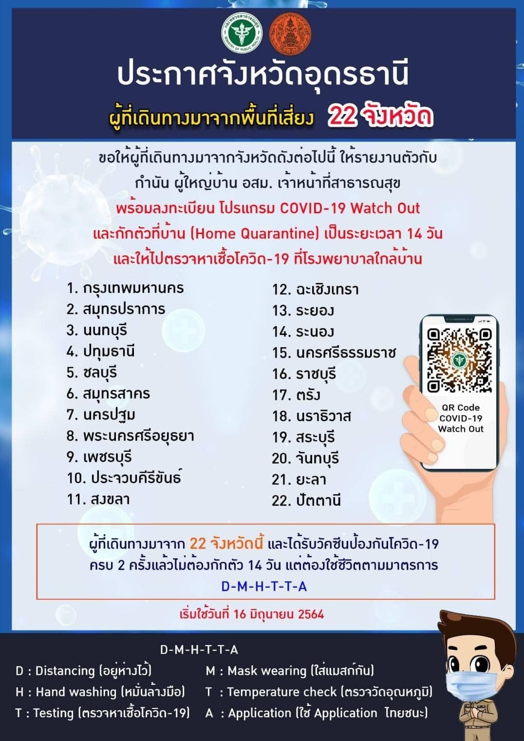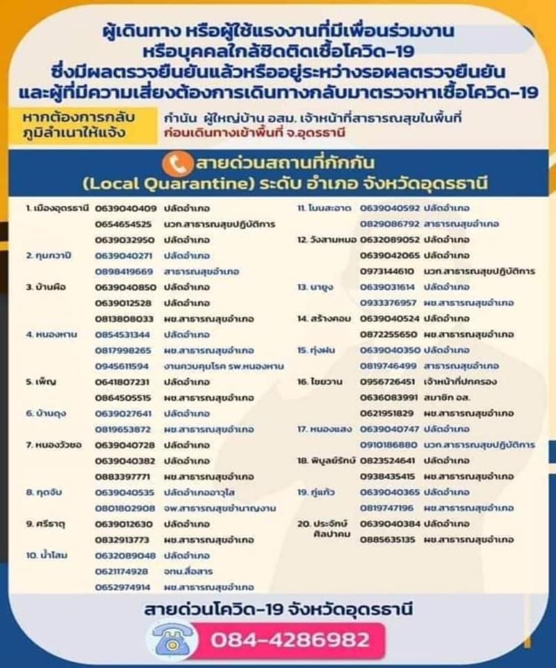 หากต้องการเดินทางกลับ จ.อุดรธานี ให้แจ้งผู้นำชุมชน เจ้าหน้าที่ อสม. หรือเจ้าหน้าที่สาธารณสุข ก่อนเดินทางเข้าพื้นที่ จ.อุดรธานี