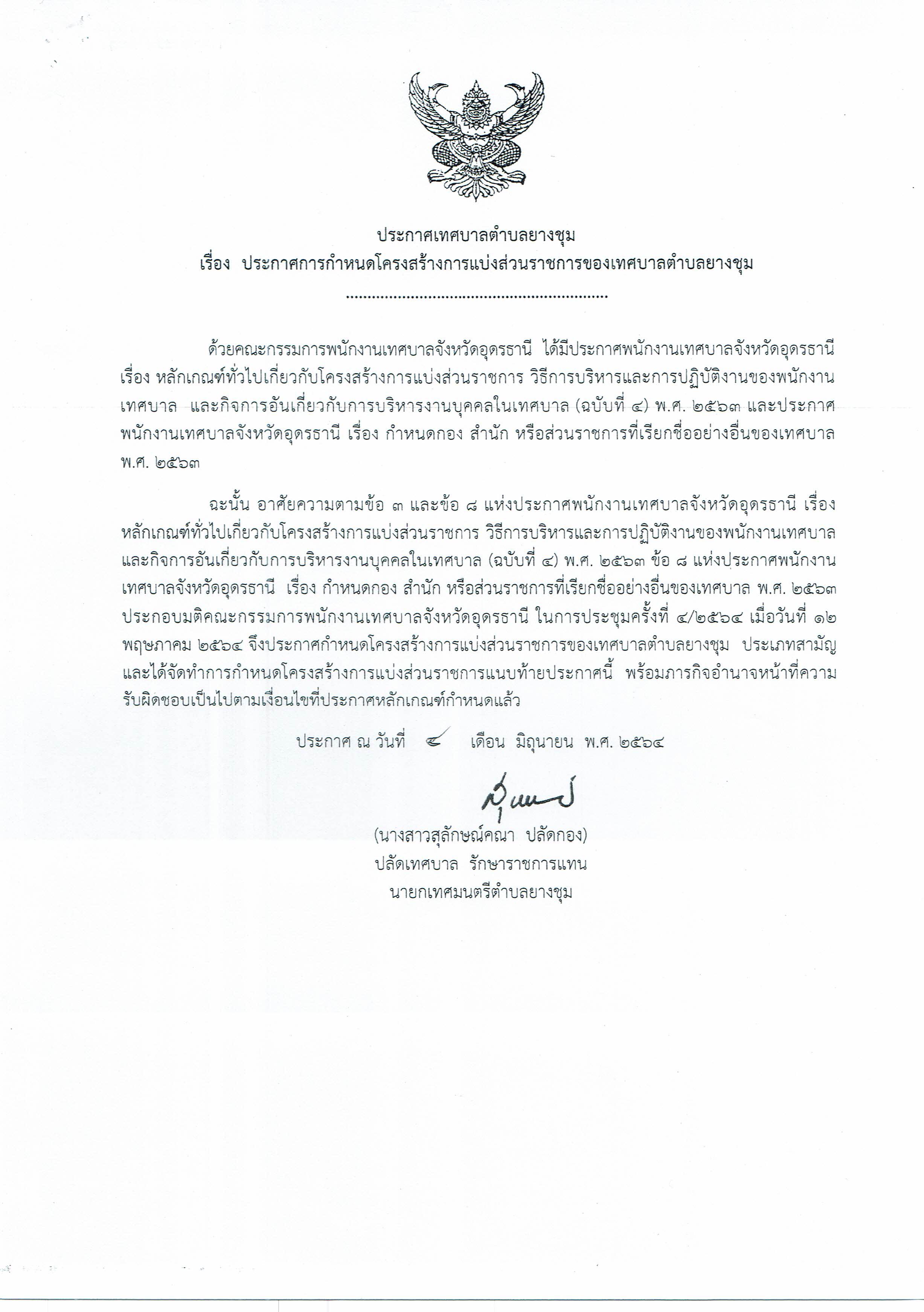 ประกาศเทศบาลตำบลยางชุม เรื่อง ประกาศกำหนดโครงสร้างการแบ่งส่วนราชการของเทศบาลตำบลยางชุม