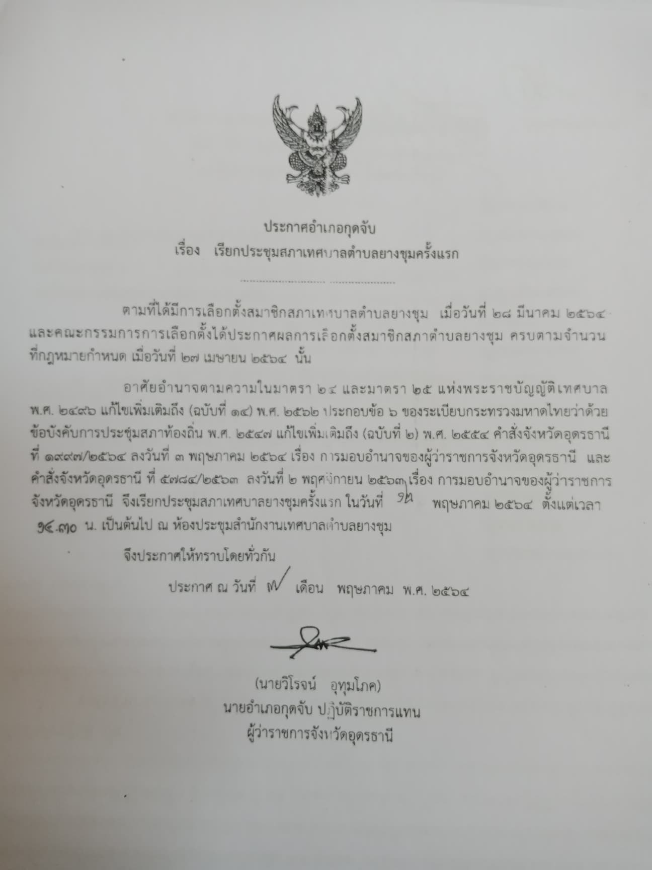 ประกาศอำเภอกุดจับ เรื่อง เรียกประชุมสภาเทศบาลตำบลยางชุมครั้งแรก