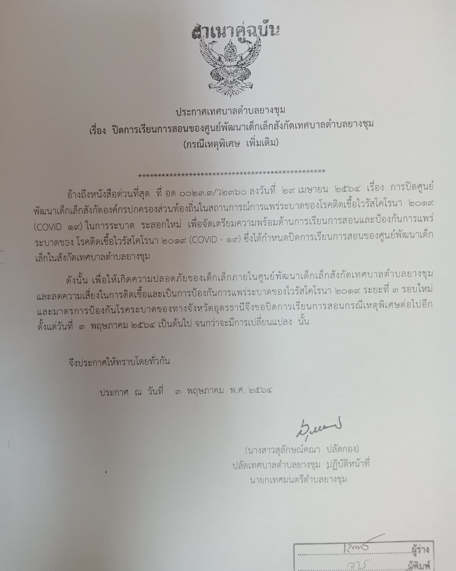 ประกาศเทศบาลตำบลยางชุม เรื่อง ปิดการเรียนการสอนศูนย์เด็กเล็กสังกัดเทศบาลตำบลยางชุม (กรณีเหตุพิเศษ เพิ่มเติม)