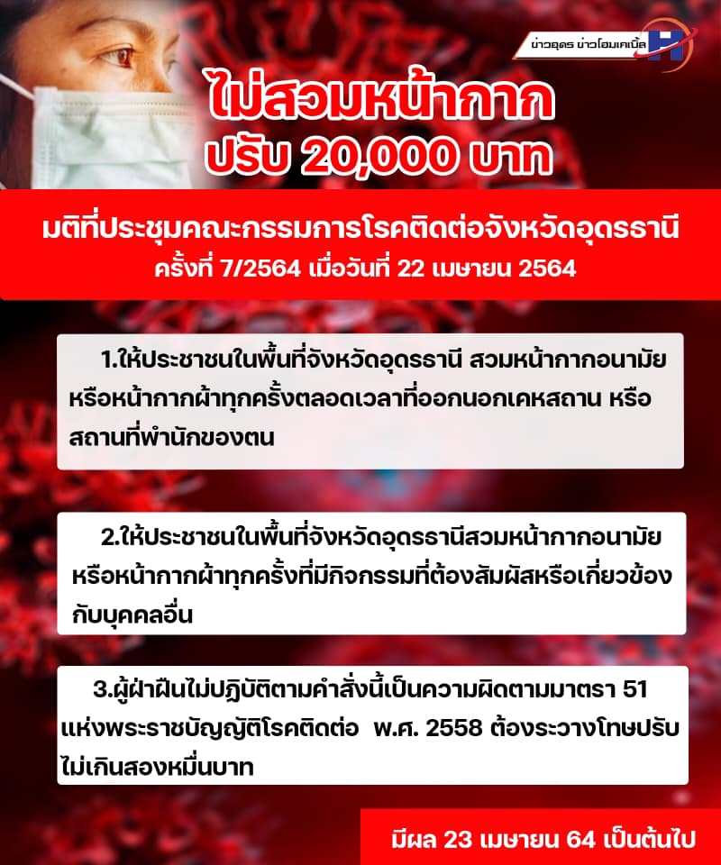 ประกาศ!! จากคณะกรรมการโรคติดต่อ จ.อุดรธานี ไม่สวมหน้ากาก ต้องระวางโทษปรับไม่เกิน 20,000 บาท เริ่ม 23 เมษายน 2564
