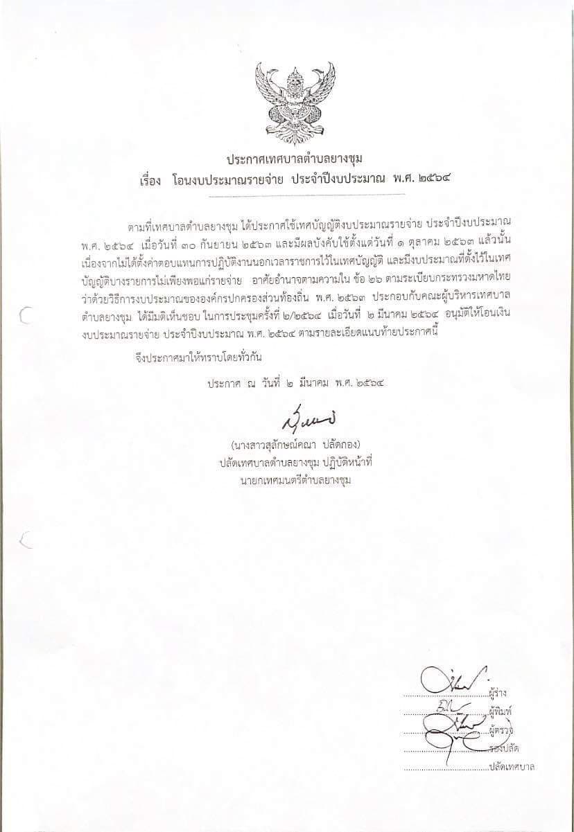 ประกาศเทศบาลตำบลยางชุม เรื่อง โอนงบประมาณรายจ่ายประจำปีงบประมาณ พ.ศ.2564