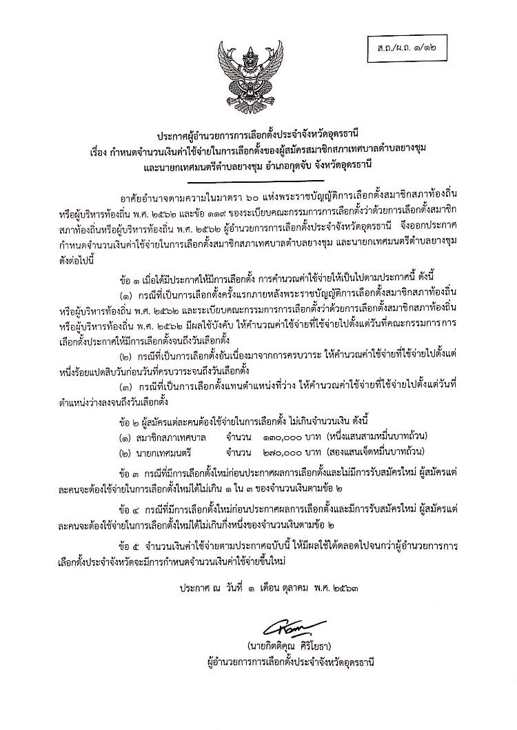 ประกาศผู้อำนวยการการเลือกตั้งประจำจังหวัดอุดรธานี เรื่อง กำหนดจำนวนเงินค่าใช้จ่ายในการเลือกตั้งของผู้สมัครสมาชิกสภาเทศบาลตำบลยางชุมและนายกเทศมนตรีตำบลยางชุม อำเภอกุดจับ จังหวัดอุดรธานี