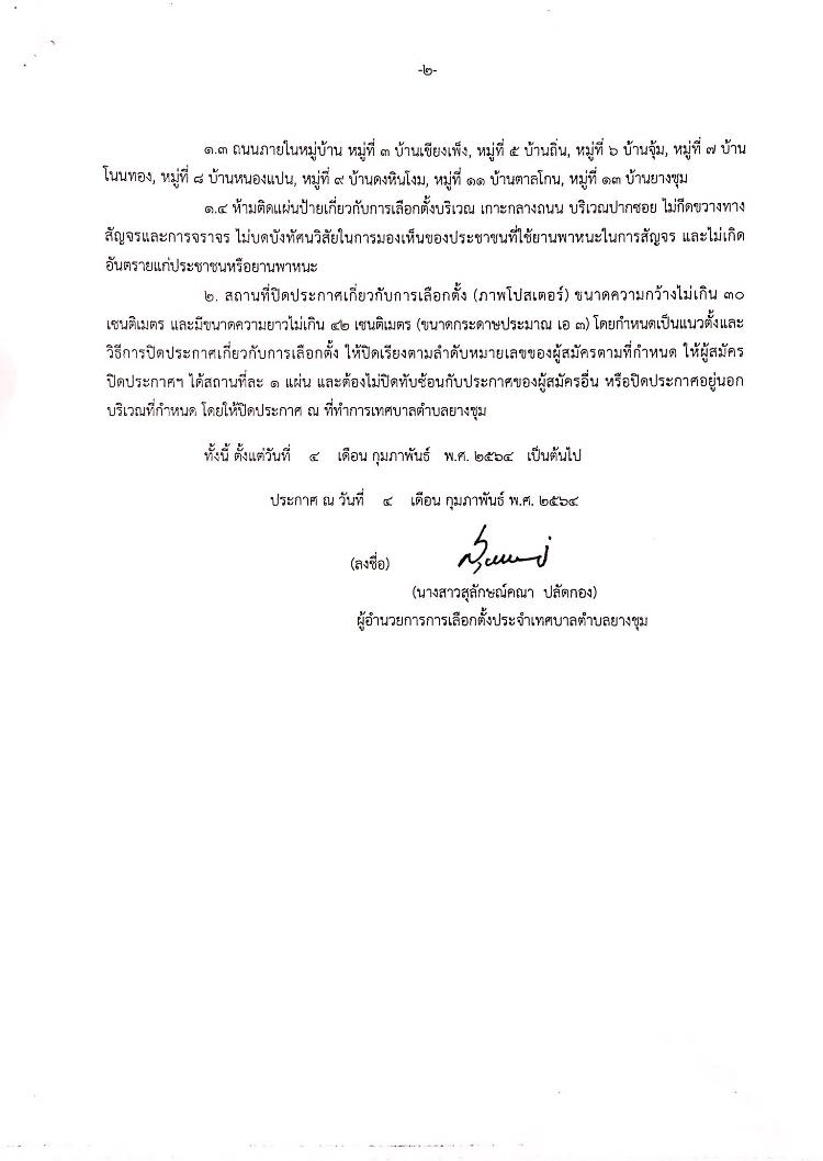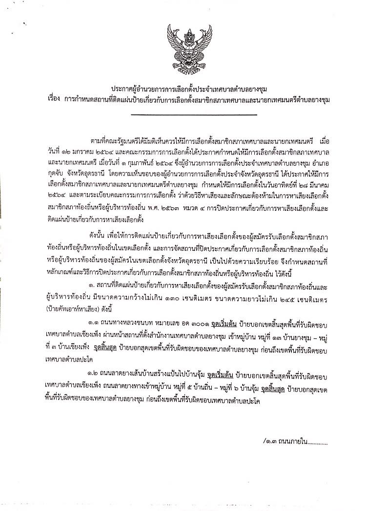ประกาศผู้อำนวยการการเลือกตั้งประจำเทศบาลตำบลยางชุม เรื่อง การกำหนดสถานที่ติดแผ่นป้ายเกี่ยวกับการเลือกตั้งสมาชิกสภาเทศบาลและนายกเทศมนตรีตำบลยางชุม