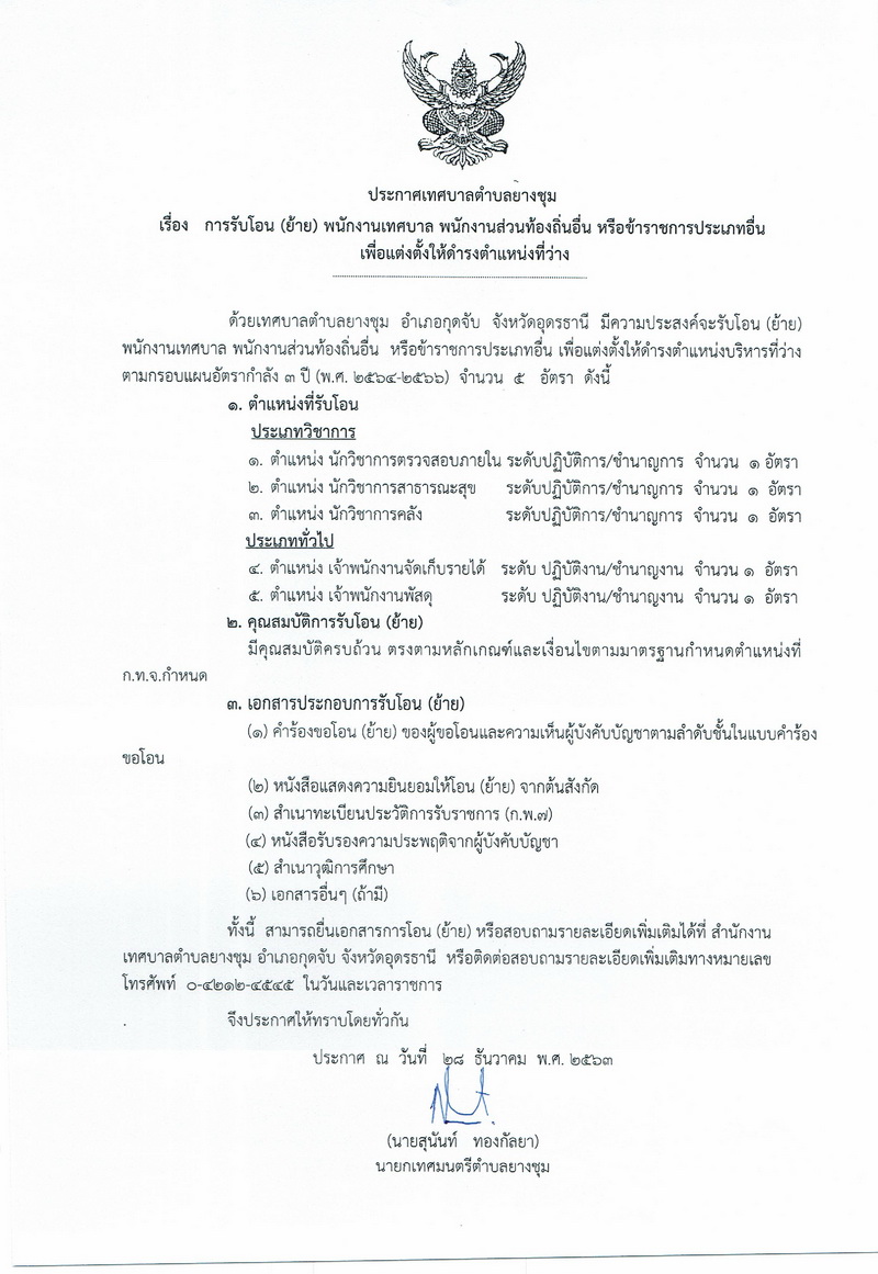 ประกาศเทศบาลตำบลยางชุม เรื่อง การรับโอน (ย้าย) พนักงานเทศบาล พนักงานส่วนท้องถิ่น หรือข้าราชการประเภทอื่น เพื่อแต่งตั้งให้ดำรงตำแหน่งที่ว่าง