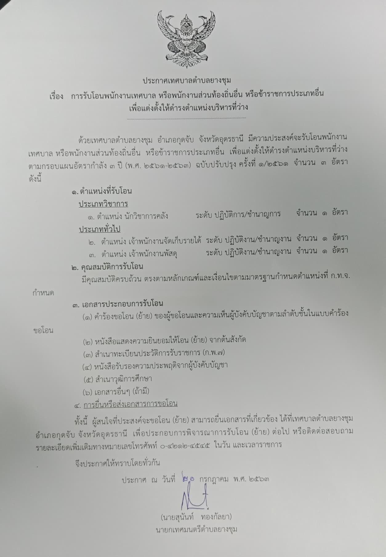 ประกาศเทศบาลตำบลยางชุม เรื่อง การรับโอนพนักงานเทศบาล หรือพนักงานส่วนท้องถิ่นอื่น หรือข้าราชการประเภทอื่นเพื่อแต่งตั้งให้ดำรงตำแหน่งบริหารที่ว่าง