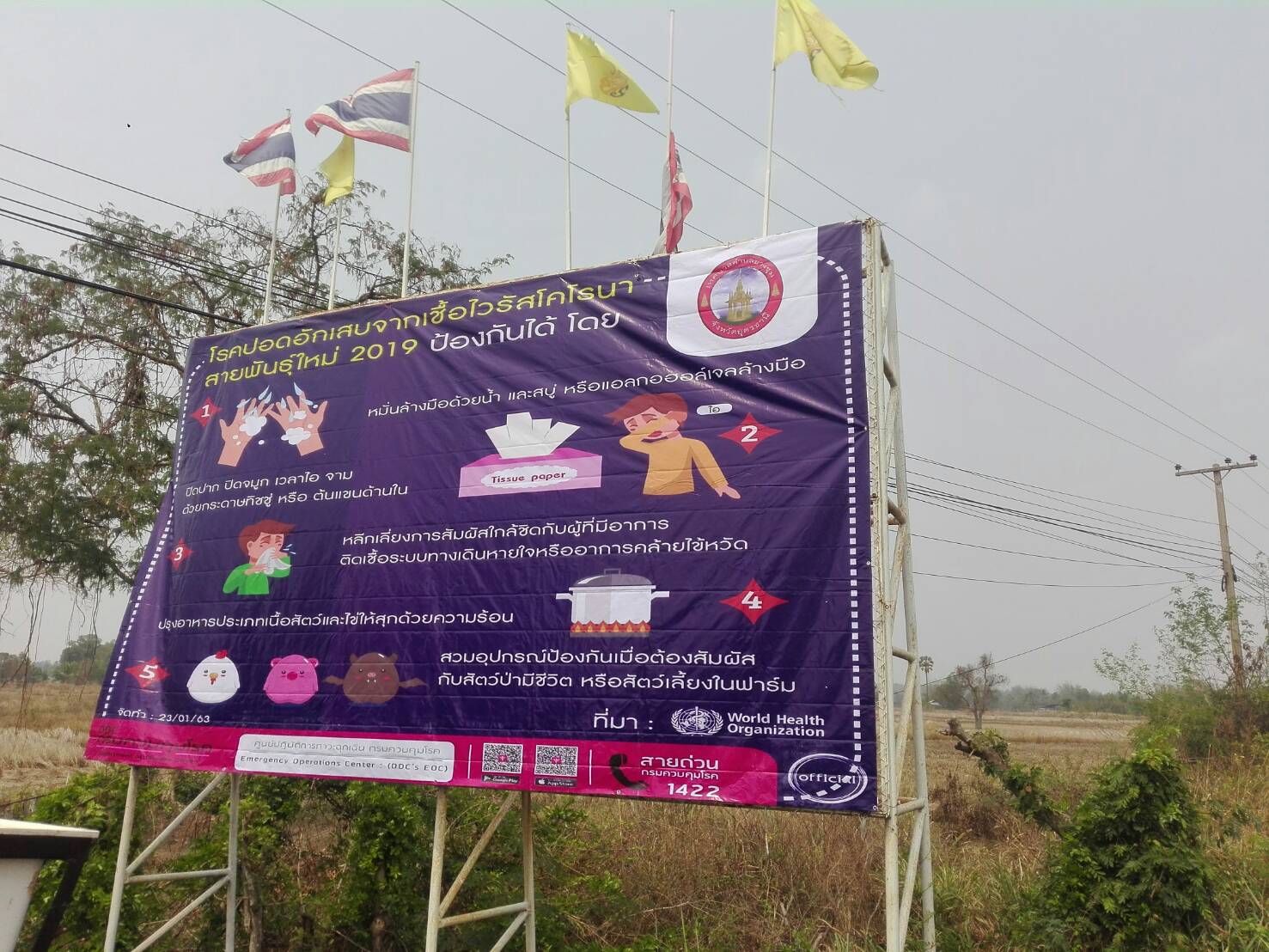 ป้ายประชาสัมพันธ์การป้องกันโรคติดเชื้อไวรัสโคโรนา 2019 (COVIT-19) เทศบาลตำบลยางชุม อ.กุดจับ จังหวัดอุดรธานี