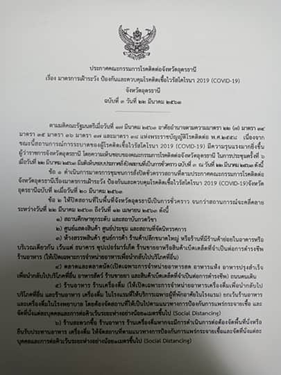 ประกาศคณะกรรมการโรคติดต่อจังหวัดอุดรธานี เรื่อง มาตรการเฝ้าระวัง ป้องกันและควบคุมโรคติดต่อเชื้อไวรัสโคโรนา 2019 (COVID-19)