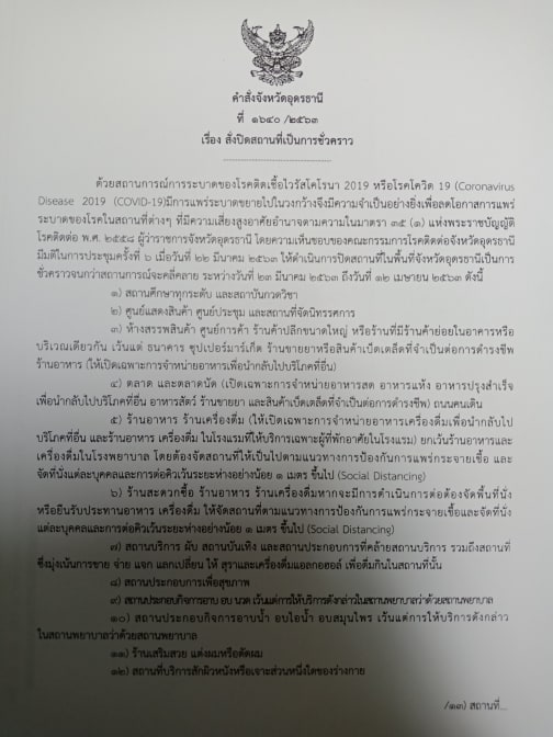 คำสั่งจังหวัดอุดรธานี ที่ 1640/2563 เรื่อง สั่งปิดสถานที่เป็นการชั่วคราว