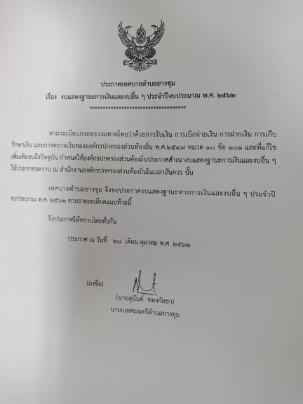ประกาศเทศบาลตำบลยางชุม เรื่อง งบแสดงฐานะการเงินและงบอื่น ๆ ประจำปีงบประมาณ พ.ศ.2562