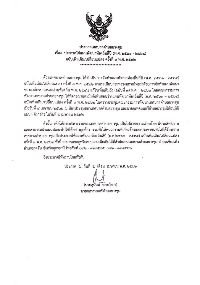 ประกาศใช้แผนพัฒนาท้องถิ่นสี่ปี (พ.ศ.2561 - 2564) ฉบับเพิ่มเติม/เปลี่ยนแปลง ครั้งที่ 3 พ.ศ.2562