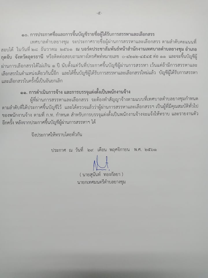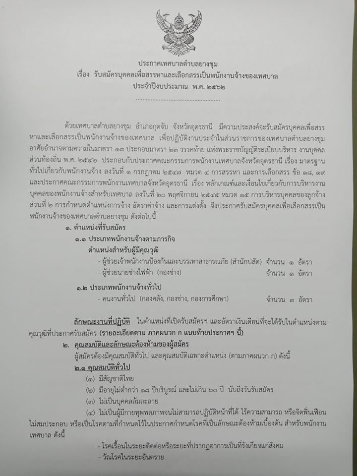 ประกาศรับสมัครบุคคลเพื่อสรรหาและเลือกสรรเป็นพนักงานจ้างของเทศบาลตำบลยางชุม ประจำปีงบประมาณ พ.ศ.2562