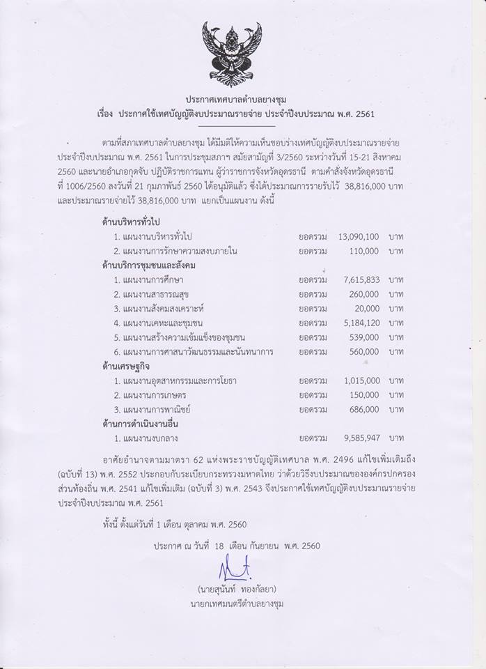 ประกาศใช้เทศบัญญัติงบประมาณรายจ่าย ประจำปีงบประมาณ 2561