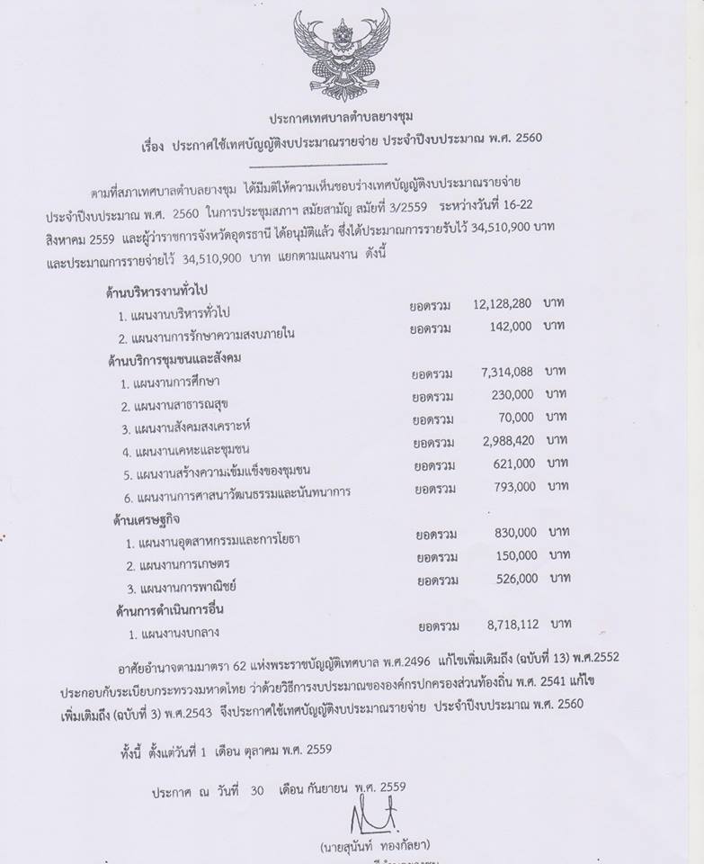 ประกาศใช้เทศบัญญัติงบประมาณรายจ่ายประจำปีงบประมาณ พ.ศ.2560