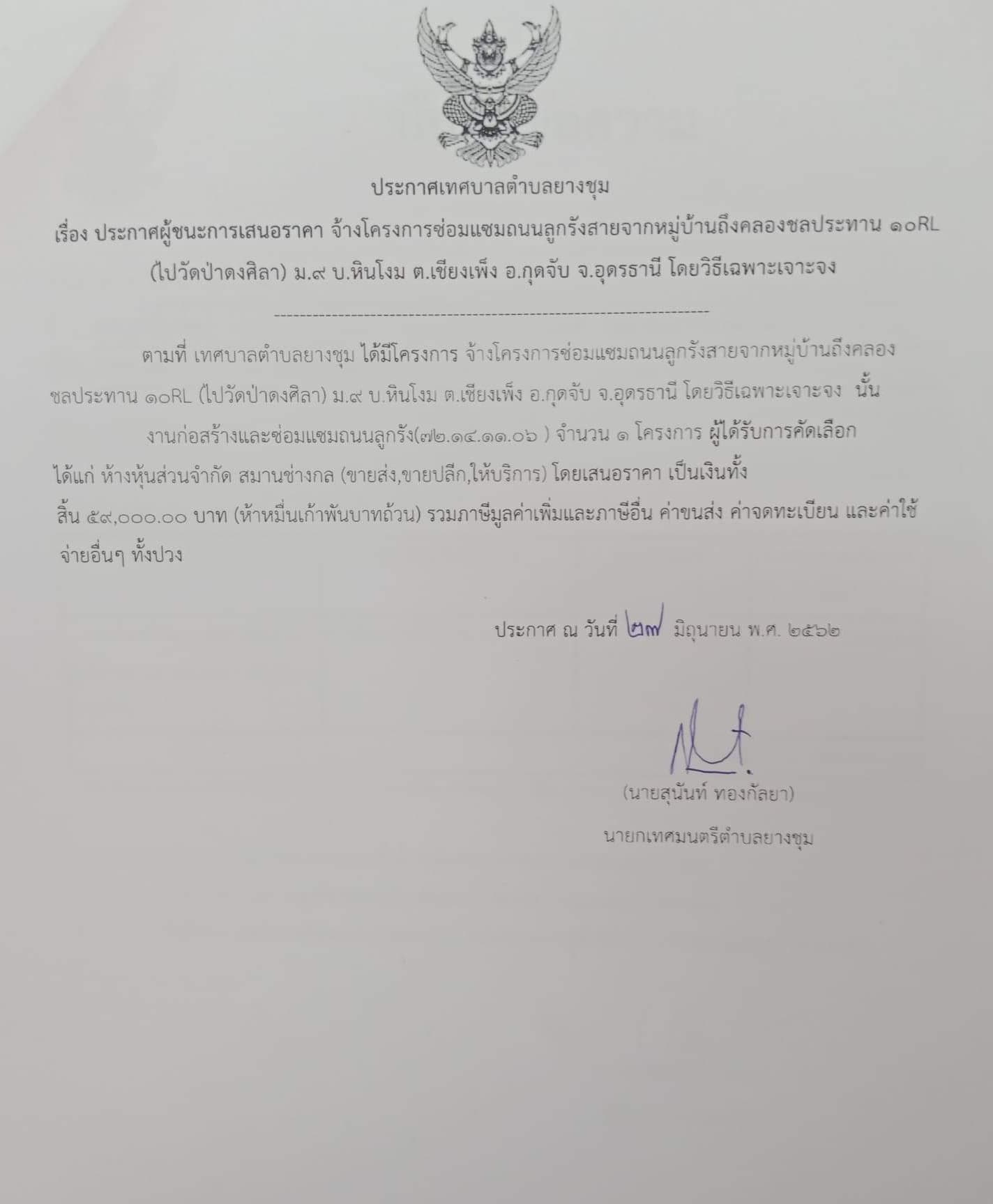 ประกาศเทศบาลตำบลยางชุม เรื่อง ประกาศผู้ชนะการเสนอราคาจ้างโครงการซ่อมแซมถนนลูกรังสายจากหมู่บ้านถึงคลองชลประทาน ๑๐RL (ไปวัดป่าดงศิลา) ม.9 บ้านหินโงม ต.เชียงเพ็ง อ.กุดจับ จ.อุดรธานี