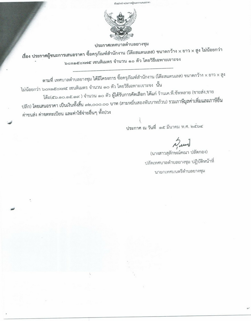 ประกาศผู้ชนะการเสนอราคา ซื้อครุภัณฑ์สำนักงาน (โต๊ะสแตนเลส) ขนาด กว้าง x ยาว x สูง ไม่น้อยกว่า ๖๐ x ๑๕๐ x ๗๕ เซนติเมตร จำนวน ๑๐ ตัว โดยวิธีเฉพาะเจาะจง