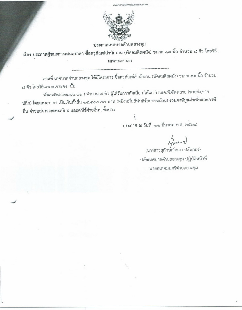 ประกาศเทศบาลตำบลยางชุม เรื่อง ประกาศผู้ชนะการเสนอราคา ซื้อครุภัณฑ์สำนักงาน (พัดลมติดผนัง) ขนาด ๑๘ นิ้ว จำนวน ๘ ตัว โดยวิธีเฉพาะเจาะจง