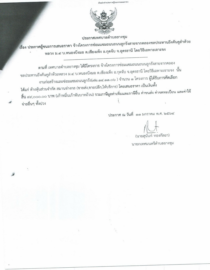 ประกาศเทศบาลตำบลยางชุม เรื่อง ประกาศผู้ชนะการเสนอราคา จ้างโครงการซ่อมแซมถนนถนนลูกรังสายจากคลองชลประทานถึงคันคูลำห้วยหลวง ม.๔ บ.หนองบึงมอ ต.เชียงเพ็ง อ.กุดจับ จ.อุดรธานี โดยวิธีเฉพาะเจาะจง