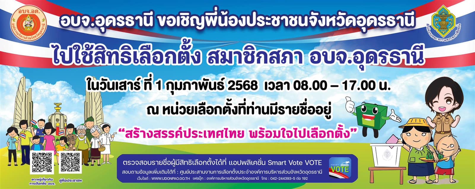 เทศบาลตำบลยางชุม ประชาสัมพันธ์ ให้พี่น้องประชาชน จังหวัดอุดรธานีไปใช้สิทธิเลือกตั้งสมาชิกสภาองค์การบริหารส่วนจังหวัดอุดรธานี ในวันเสาร์ ที่ 1 กุมภาพันธ์ 2568 เวลา 08:00 น. - 17:00 น. ณ หน่วยเลือกตั้งที่ตนมีชื่อเป็นผู้มีสิทธิในหน่วยเลือกตั้งนั้น